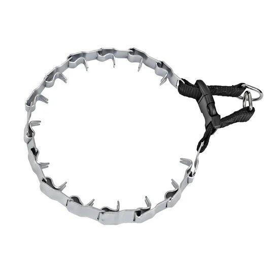 Ошейник из металлических пластин с загнутыми со стороны шеи собаки шипами. Крайние звенья крепятся к стропам и закрепляются на фастекс. Детали ошейника оцинкованные. Ошейник собран из 17 оцинкованных звеньев - 14 основных звеньев, 2 крайних звена, 1 соединительное звено. Ширина звена 2,2 см. Длина ошейника 60см.