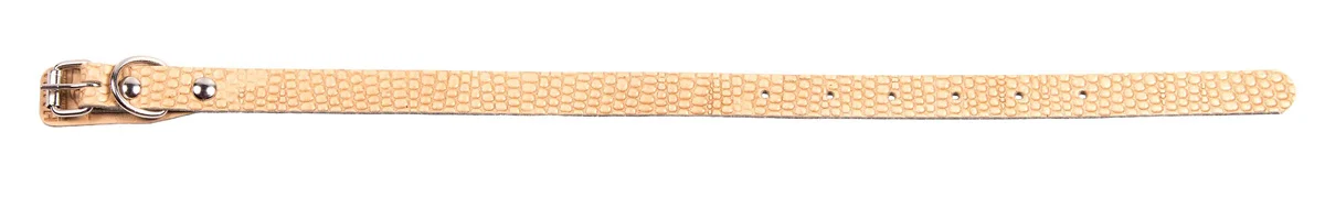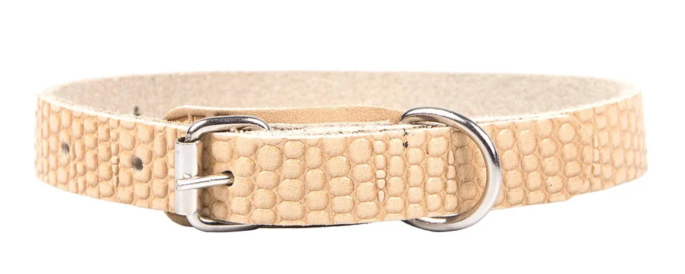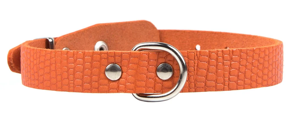 Однослойный ошейник из тисненой натуральной кожи, не прошитый, ширина 14 мм, полукольцо посередине.