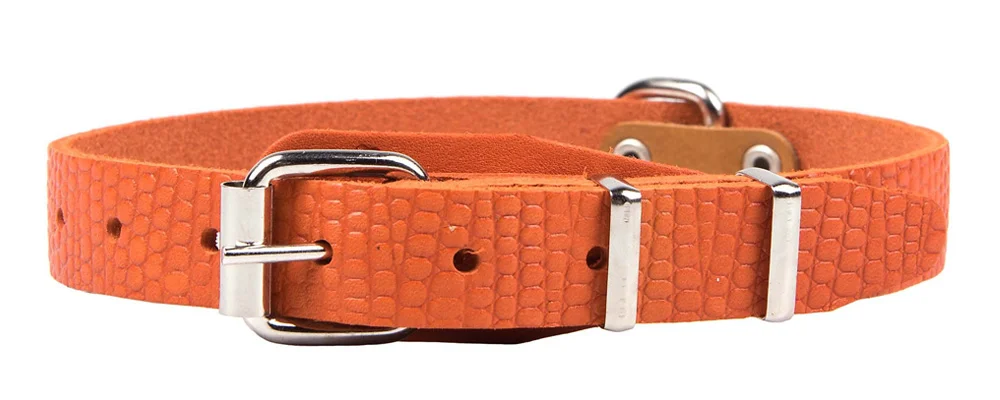 Серия ошейников “Рептилия” из натуральной шорно-седельной кожи с фактурным тиснением под рептилию - простые, универсальные, с украшениями и адресной биркой.