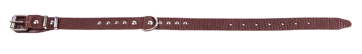 Однослойный ошейник из тисненой натуральной кожи, украшенный металлическими заклепками, не прошитый, полукольцо посередине.