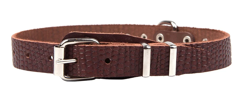 Серия ошейников “Рептилия” из натуральной шорно-седельной кожи с фактурным тиснением под рептилию - простые, универсальные, с украшениями и адресной биркой.