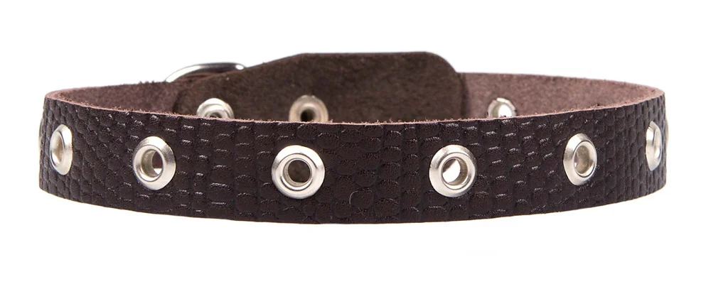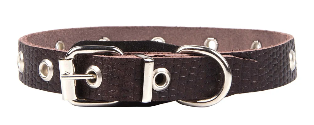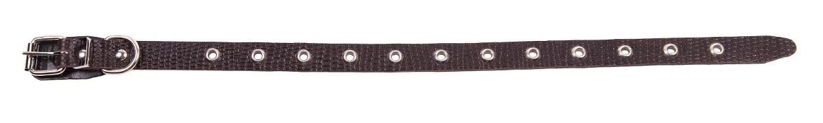 Однослойный ошейник из тисненой натуральной кожи, не прошитый, отверстия укреплены металлической блочкой, полукольцо у пряжки.