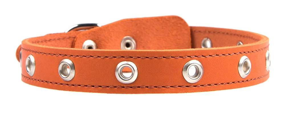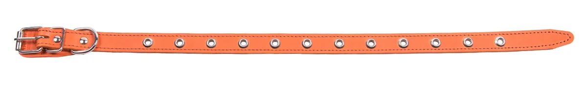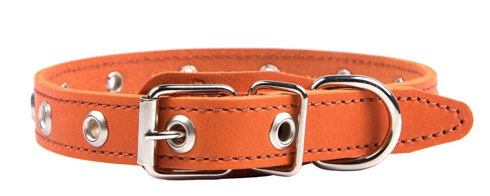 Однослойный ошейник из натуральной кожи, прошит декоративной строчкой, отверстия укреплены металлической блочкой, полукольцо у пряжки.