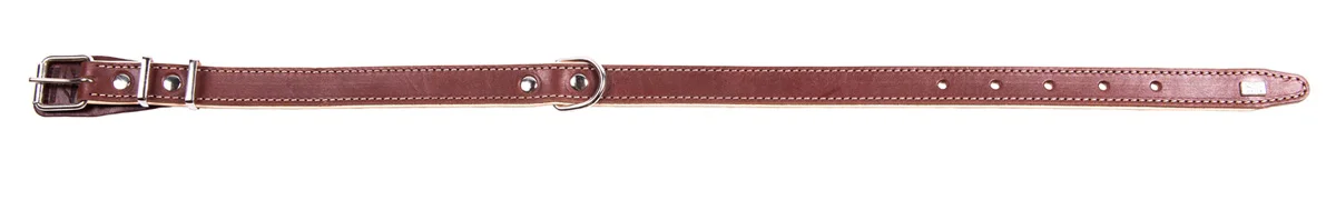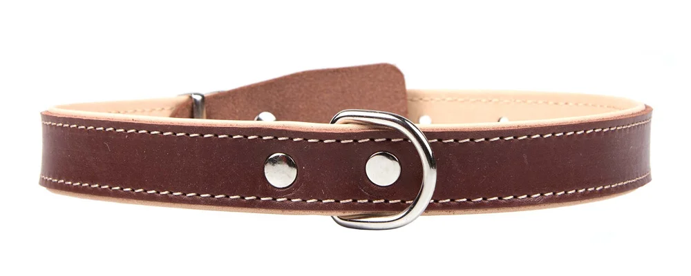 Трехслойный ошейник из натуральной кожи, края в загибку, проклеен и прошит декоративной строчкой, полукольцо посередине.