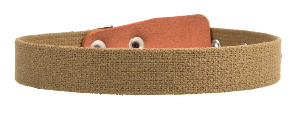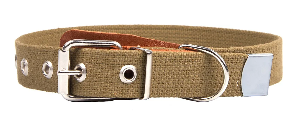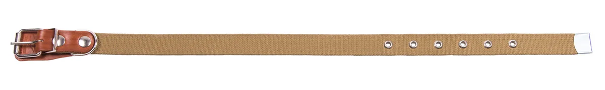 Ошейник однослойный из брезентовой ленты ЛРТо. Материал - хлопок. Толщина (мм): 2,7 ± 0,3. Разрывная нагрузка: 200 кгс. Вставки под фурнитуру из натуральной кожи. Отверстия укреплены металлической блочкой. Металлический или кожаный наконечник.