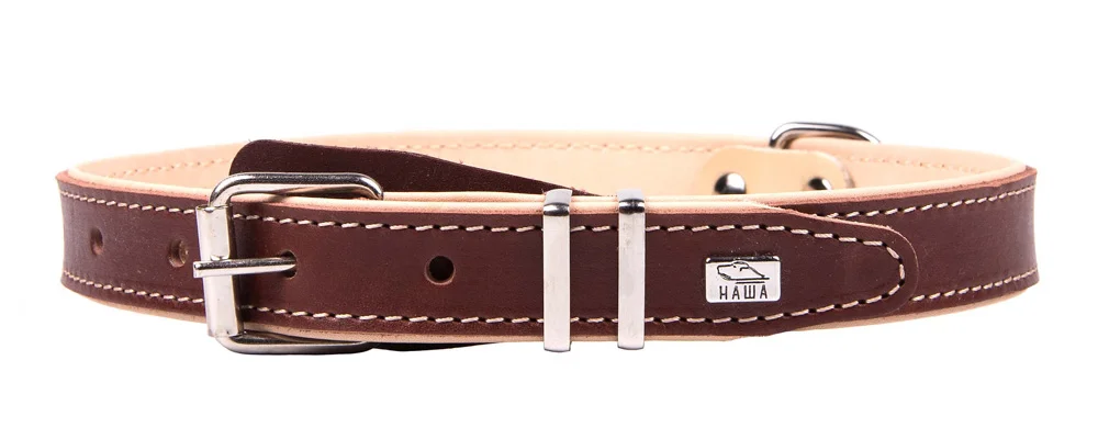 Трехслойный ошейник из натуральной кожи, края в загибку, проклеен и прошит декоративной строчкой, полукольцо посередине.