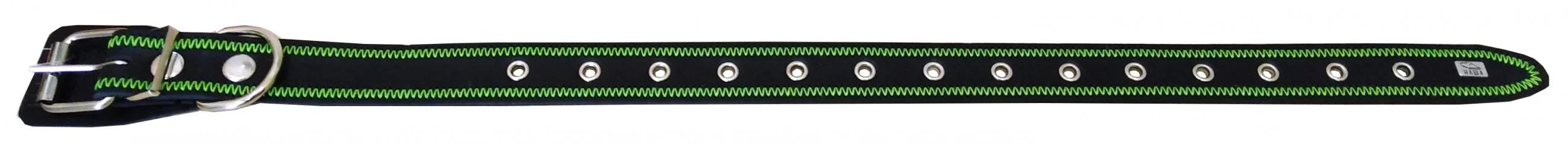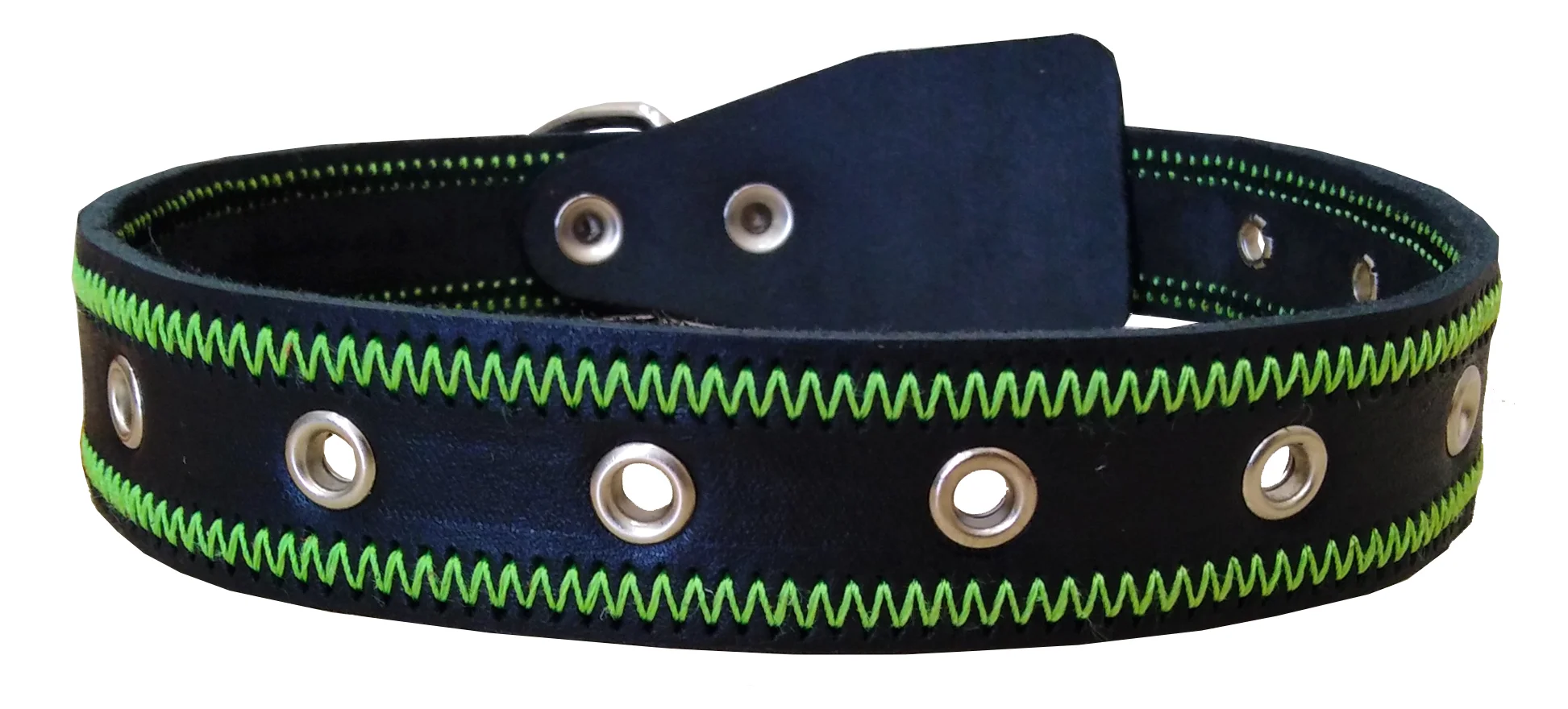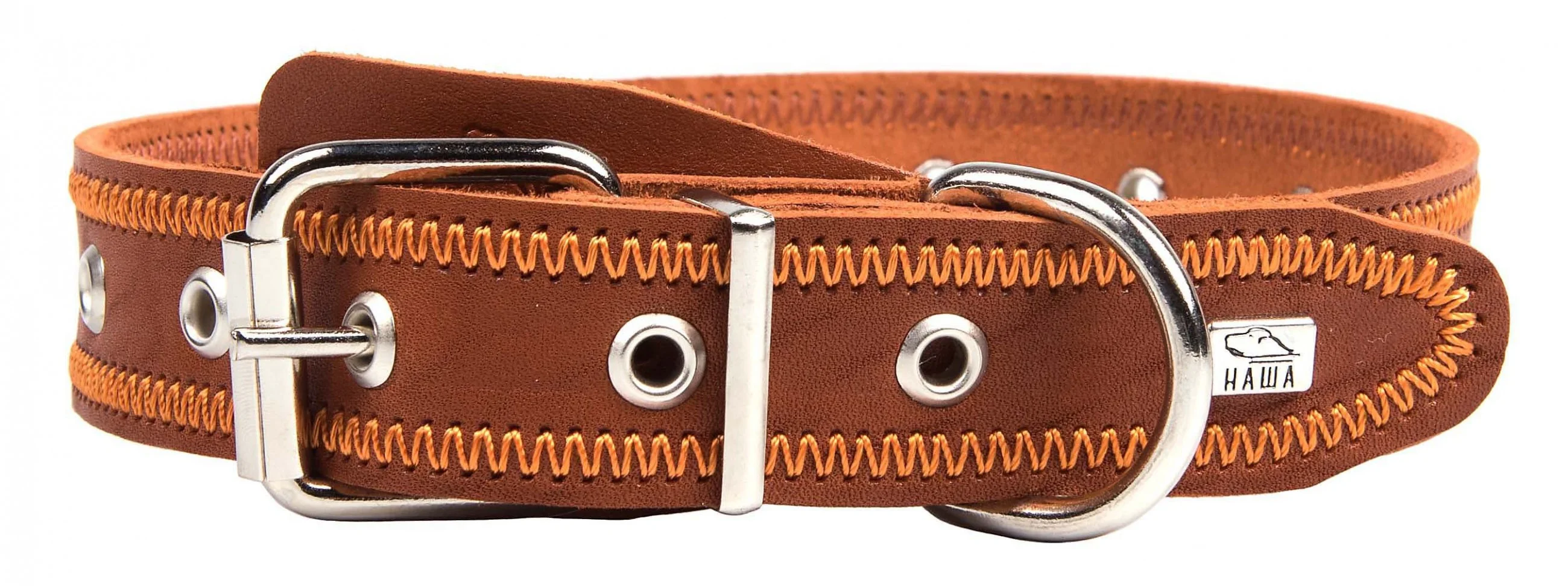Однослойный ошейник из натуральной кожи, прошит декоративной строчкой “зигзаг”, отверстия укреплены металлической блочкой, полукольцо у пряжки.