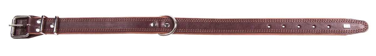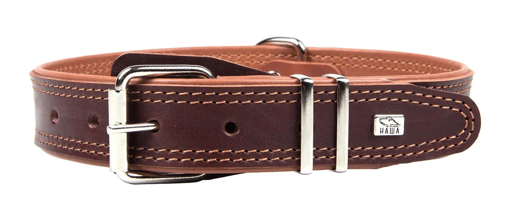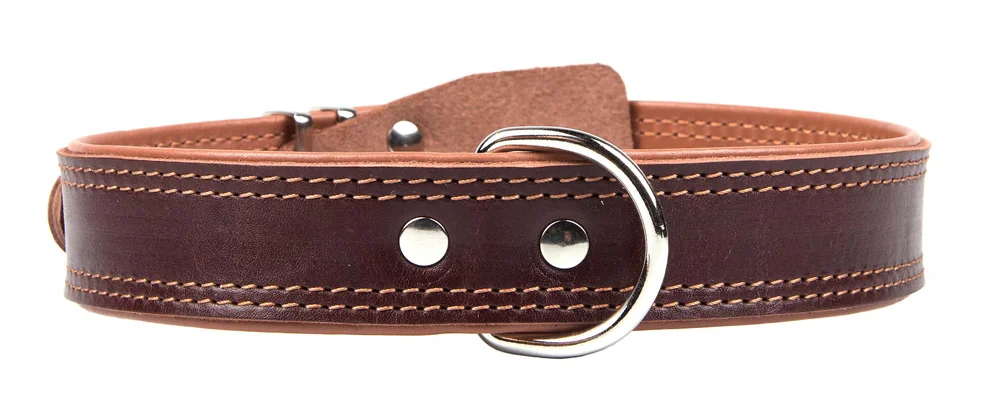 Трехслойный ошейник из натуральной кожи, края в загибку, проклеен и прошит декоративной строчкой, полукольцо посередине.
