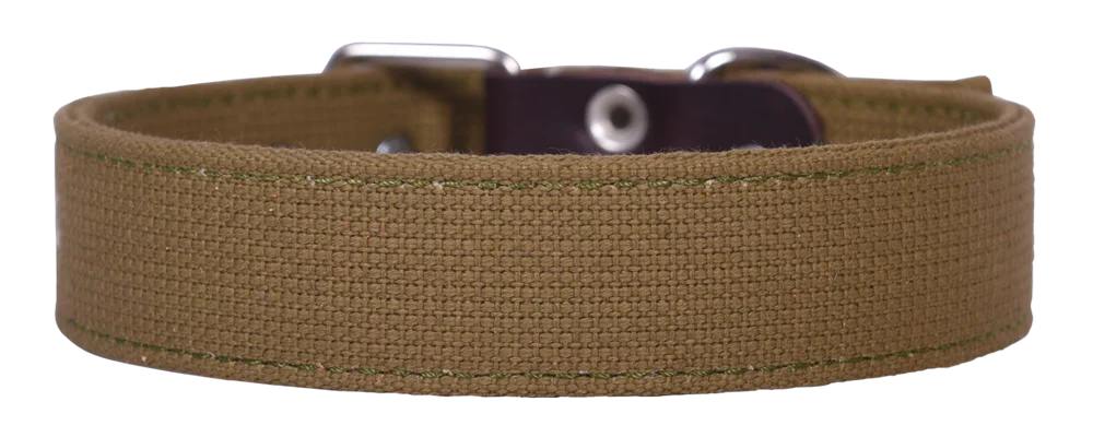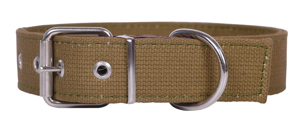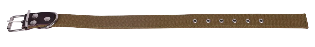 Ошейник двухслойный из брезентовой ленты ЛРТо, прошитый. Материал - хлопок. Толщина (мм): 2,9 ± 0,3. Разрывная нагрузка: 290 кгс. Вставки под фурнитуру из натуральной кожи. Отверстия укреплены металлической блочкой.