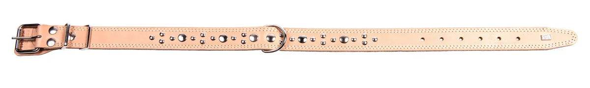 Двухслойный ошейник из натуральной кожи с металлическими украшениями, проклеен, прошит декоративной строчкой, полукольцо у пряжки.