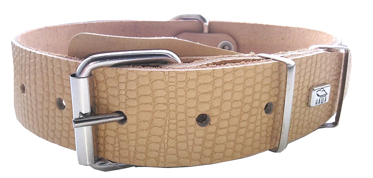 Серия ошейников “Рептилия” из натуральной шорно-седельной кожи с фактурным тиснением под рептилию - простые, универсальные, с украшениями и адресной биркой.