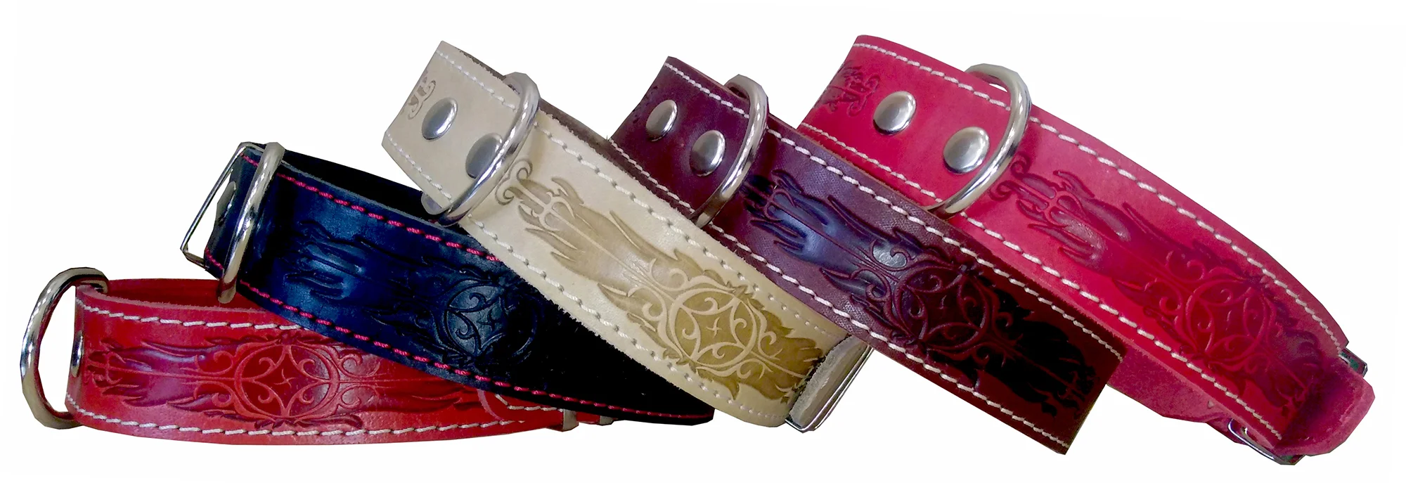 Ошейники из натуральной кожи и комбинированные, однослойные, двуслойные и трехслойные, гладкие и украшенные, с адресной биркой и светоотражающей полосой, строгие и с грузами для тренировок.