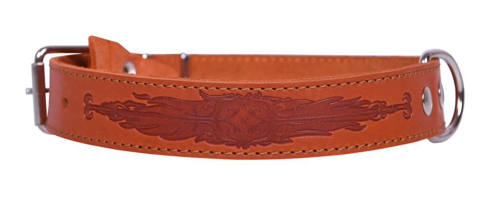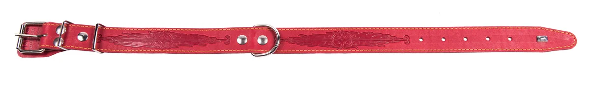 Однослойный ошейник из натуральной кожи, украшенный фактурным тиснением, прошитый декоративной строчкой, полукольцо посередине.