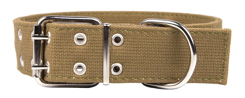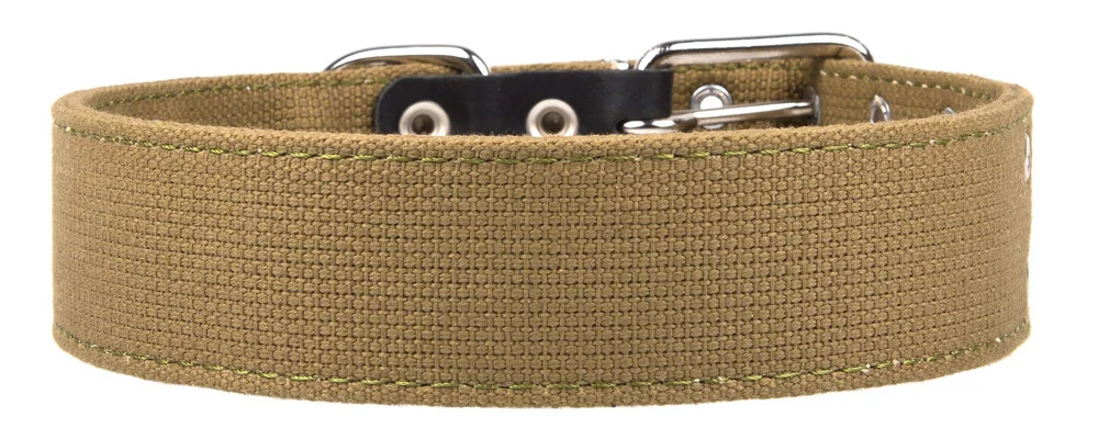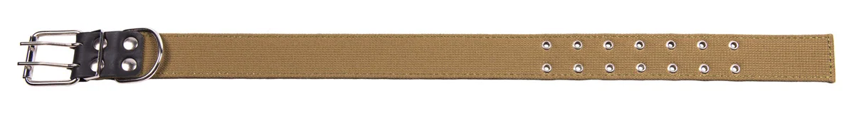 Ошейник двухслойный из брезентовой ленты ЛРТо, прошитый. Материал - хлопок. . Вставки под фурнитуру из натуральной кожи. Отверстия укреплены металлической блочкой.