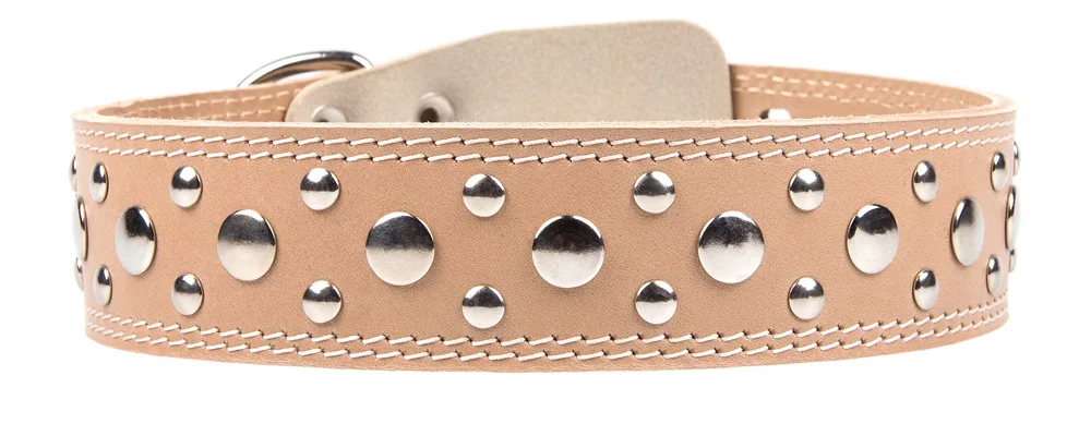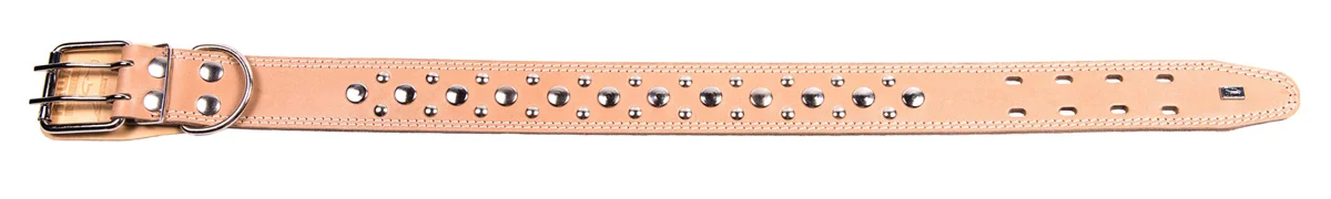 Двухслойный ошейник из натуральной кожи, украшенный металлическими заклепками, проклеен, прошит декоративной строчкой, полукольцо посередине.