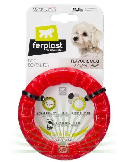 Правильная гигиена полости рта очень важна для наших четвероногих друзей. В дополнение к здоровому питанию и регулярной чистке зубов зубной щеткой, мы советуем вам прибегать к использованию специальных жевательных игрушек, которые одновременно развлекут и доставлят удовольствие вашему питомцу, а также послужат стимулом для совершения собакой жевательных движений.Smile от Ferplast - идеальный помощник в достижении этой цели! Это игрушечное кольцо для собак помогает вашему питомцу чистить зубы посредством совершения привычных механических жевательных движений. В состав игрушки входят кристаллы бикарбоната, которые способствуют уменьшению зубного налета и профилактике образования зубного камня, а также поддерживают идеальную гигиену полости рта вашего питомца и помогают сохранить дыхание свежим. Кроме того, благодаря неровной поверхности, игрушка поддерживает в тонусе мышцы рта и приятно массирует десны собаки. Её можно наполнить вкусным кормом, чтобы пробудить ещё больший интерес вашего пушистого питомца к игре