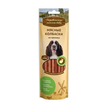 Очень вкусные и полезные лакомства в форме колбасок несомненно придутся по вкусу Вашему домашнему питомцу. Они идеально подходят для угощения и расширения повседневного рациона питания собак любых пород, а также в качестве поощрения во время дрессировки. Ароматные и сочные кусочки мяса кролика мгновенно привлекут внимание животного и придадут дополнительную мотивацию при выполнении команд. Продукт является гипоаллергенным, не содержит красителей, усилителей вкуса и консервантов. Уникальный процесс приготовления позволяет сохранить все вкусовые качества натуральных ингредиентов, а также витамины и минералы, которыми они богаты. Отличный вкус и несомненная польза делают серию продуктов “Деревенские лакомства” превосходным угощением для любимых питомцев.
