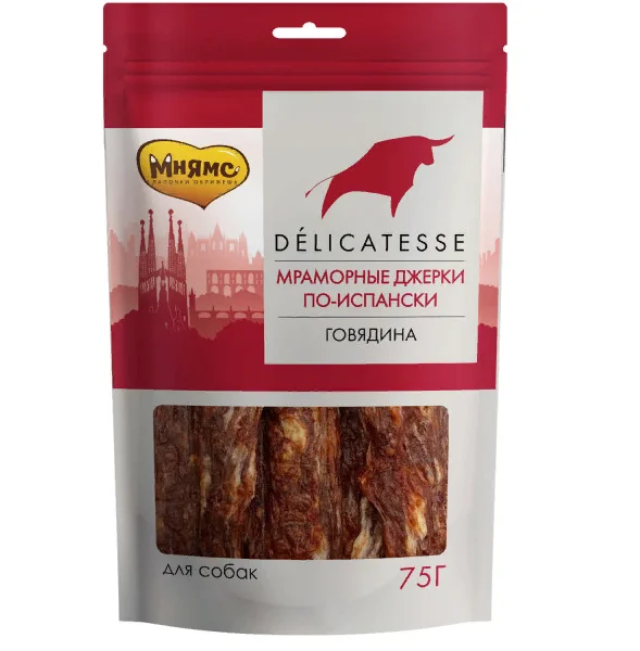 Мраморные джерки по –испански – популярное блюдо не только в Европе и Африке, но и во всем мире. Этот натуральный деликатес готовят из вяленого мраморного мяса молодых бычков. Мясо нарезают тонкими слайсами, укладывают слоями в специальную ёмкость и пересыпают смесью из перца и соли, накрывают фольгой и на сутки помещают в холодильник. Спустя сутки, выкладывают мясные слайсы на специальную решетку для сушки и вялят несколько часов. В результате получается очень вкусный и полезный мясной деликатес! . Подробнее: https://kotmatros.ru/mnyams-mramornye-dzherki-po-ispanski-lakomstvo-dlya-sobak-75-g/?utm_campaign=copy