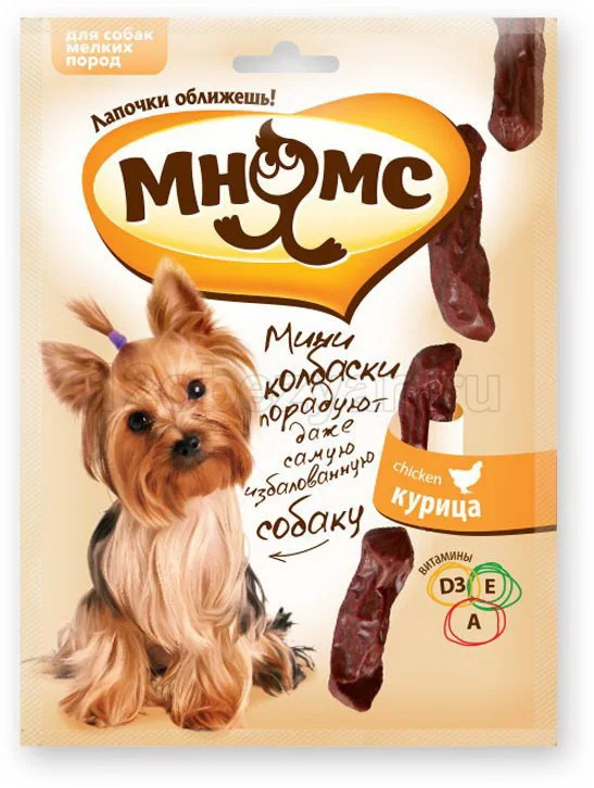 Мини-колбаски с курицей от «Мнямс» - это вкусное и здоровое лакомство с высоким содержанием мяса, которое придется по вкусу даже самому капризному любимцу.