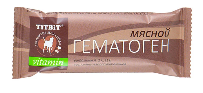 Гематоген мясной Vitamin - это профилактическое лакомство для собак, обогащённое комплексом витаминов. Разработано на основе классической рецептуры гематогена с учетом физиологических особенностей животных. Стимулирует образование эритроцитов (красных кровяных телец); повышает содержание гемоглобина в крови; обогащает организм железом; нормализует обмен веществ; содержит белки, жиры и углеводы в легкоусвояемой форме; рекомендуется включать в рацион ослабленных и перенесших операции собак. Не содержит сахара.