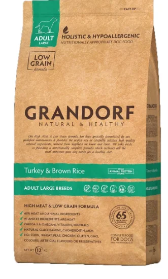 Сухой корм для взрослых собак крупных пород Grandorf Turkey & Brown Rice Large Breeds Индейка с бурым рисом - низкозерновая формула (темно зеленая полоса на упаковке).