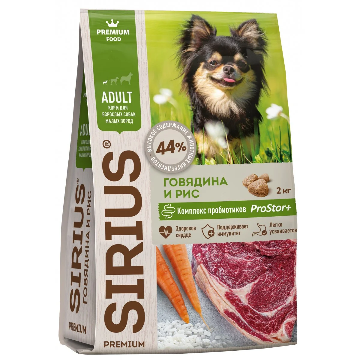 SIRIUS — сухой корм премиум класса для полноценного ежедневного рациона взрослых собак малых пород. Высокое содержание мясных ингредиентов обеспечивает оптимальный уровень белка и укрепляет мышцы. Баланс витаминов и комплекса пробиотиков 4-го поколения PROSTOR+ нормализует пищеварение и укрепляет иммунитет. Омега 3 и Омега 6 способствуют поддержанию здоровья сердца, мозга, нервной системы, здоровья кожи и красоты шерсти