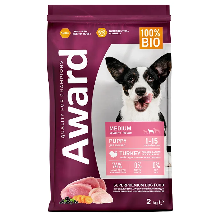 Сухой корм AWARD для щенков от 1 мес, беременных и кормящих сук средних пород с индейкой и курицей с добавлением моркови и черной смородины 2 кг.