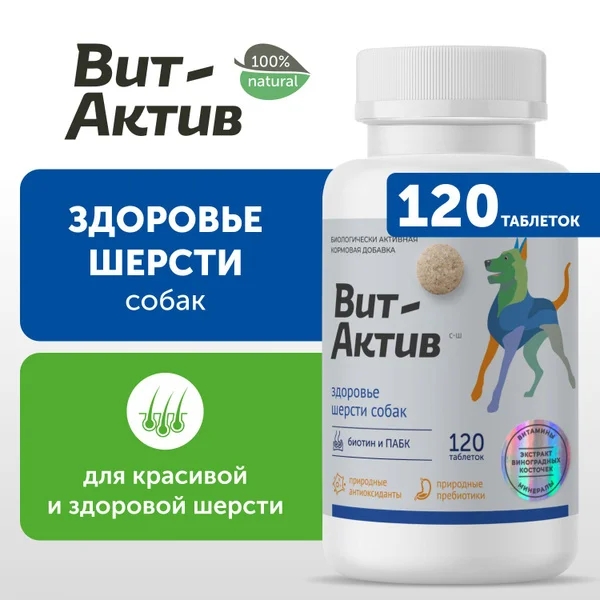 Вит-Актив — витаминно-минеральный комплекс для улучшения состояния кожно-шерстного покрова, обеспечения физиологических потребностей собак в витаминах, аминокислотах и минеральных веществах, обогащения рациона природными антиоксидантами и пребиотиками.