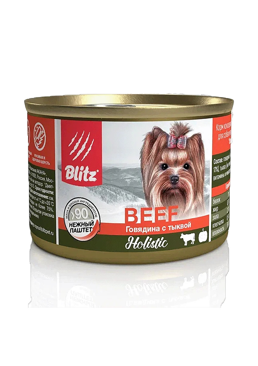 Ваша собака достойна самого лучшего, и мы создали для неё великолепный рацион, способный удовлетворить все её жизненные потребности. Влажный корм Blitz «Говядина с тыквой» для собак в возрасте от одного года более чем на 90% состоит из говядины и индейки — гипоаллергенных видов мяса, что особенно важно для питомцев, склонных к пищевой аллергии и непереносимости. Мы точно указываем процентное содержания мяса в консервах Blitz: говядины не менее 74%, индейки не менее 17% — считаем, что владельцам это важно знать, так они могут быть уверены в высоком качестве корма и его соответствии природному рациону плотоядных животных.