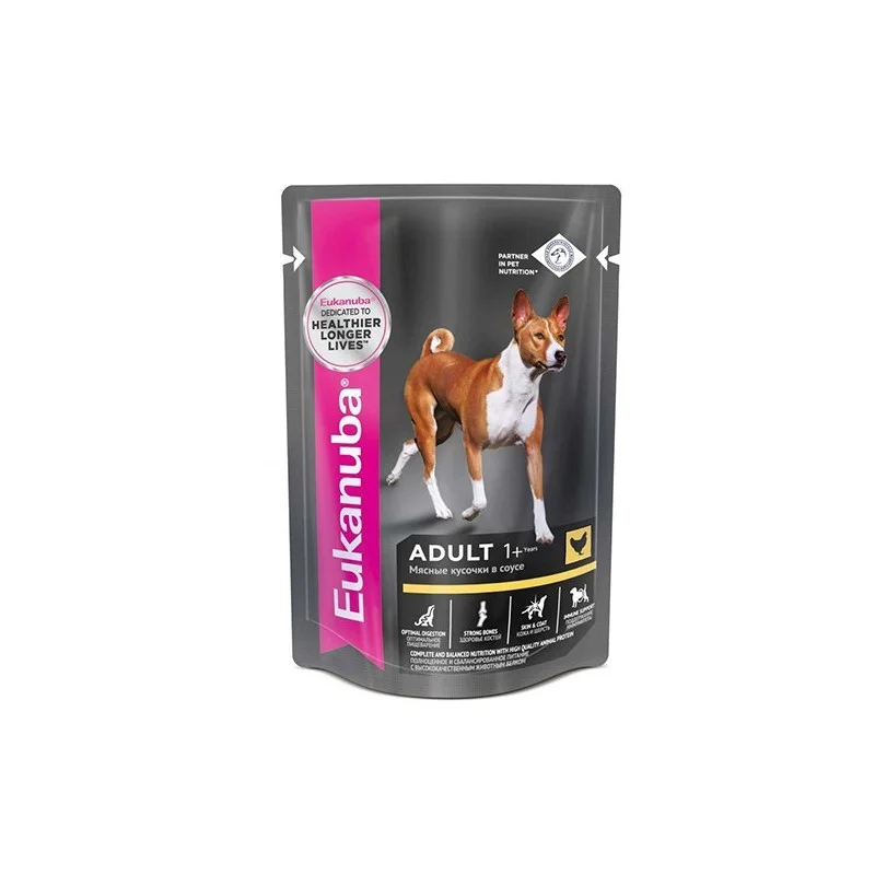 Eukanuba Adult 1+ Chicken (Курица), 100 г - это сбалансированный влажный корм для собак 1 года. Он поддерживает здоровье кишечной микрофлоры за счет включения клетчатки и пребиотиков, благотворно влияет на рост и развитие.