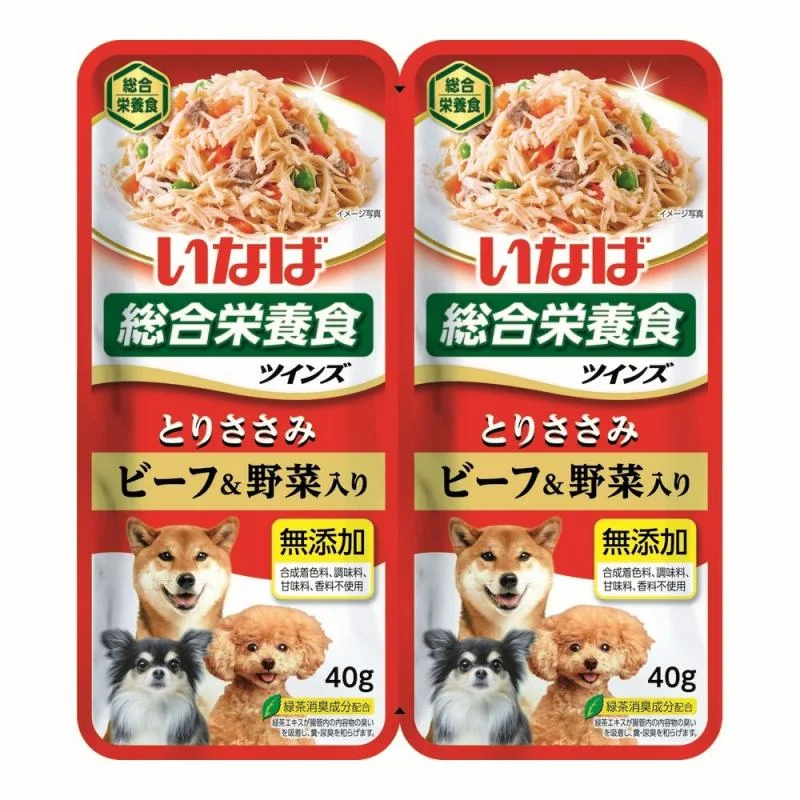 Суперпремиальный влажный корм для собак INABA TWINS (ИНАБА ТВИНС) от японского производителя Inaba приготовлен на основе нежного куриного филе с добавлением овощей и говядины. Корм имеет высокопитательный состав и богат витаминами и минералами. Корма и лакомства Inaba отличаются высоким качеством и неповторимым вкусом, ведь они изготавливаются на основе отборных традиционных японских ингредиентов! Во все продукты добавлен экстракт зеленого чая, который, благодаря содержанию катехина, обладает нейтрализующим действием на запах содержимого кишечника. В состав добавлен витамин Е - натуральный антиоксидант, поддерживающий иммунную систему. Без искусственных добавок, красителей и консервантов.