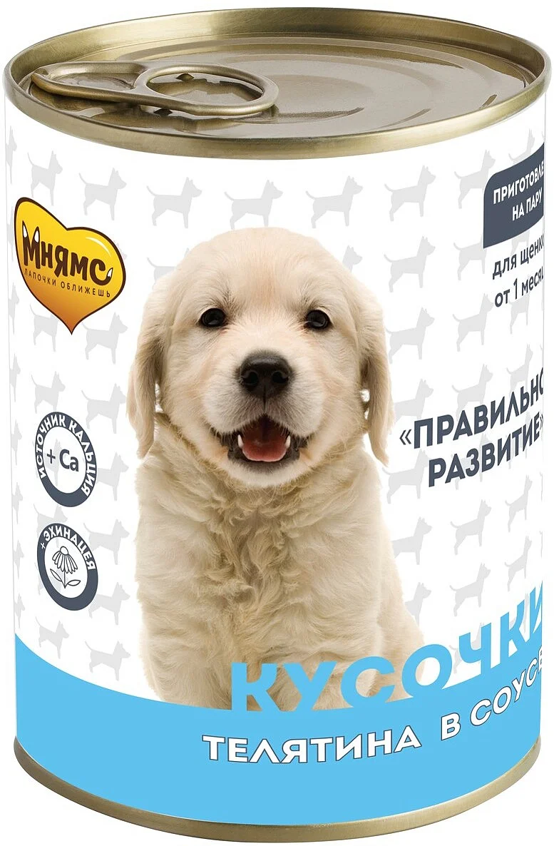 Любознательным и подвижным щенкам на этапе роста особенно нужен сбалансированный и здоровый рацион. Кусочки в соусе с телятиной – такие мясные и такие сытные – помогут малышу всегда быть в активной форме, расти сильным и крепким и дарить счастье всем вокруг. Заботьтесь о своем щенке правильно вместе с «Мнямс».