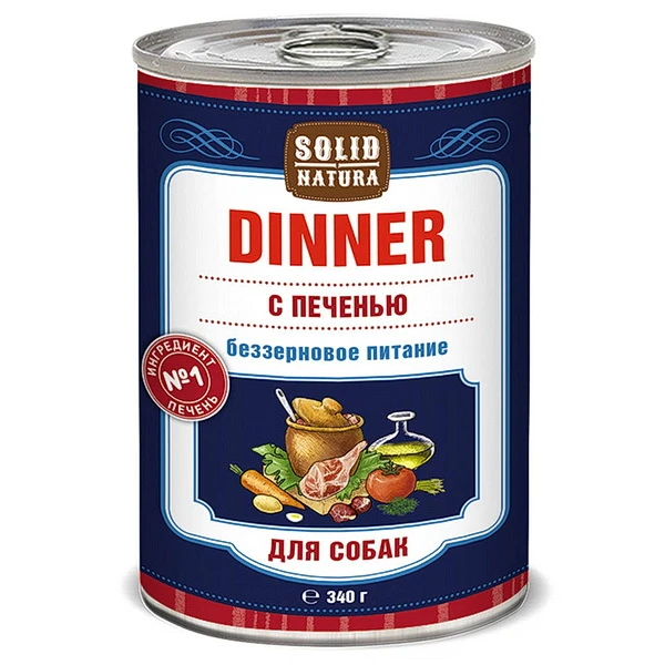 Solid Natura Dinner с печенью - консервированное влажное питание класса премиум для собак. Нежная консистенция в виде фарша, отличная поедаемость, в составе отсутствуют зерновые культуры.