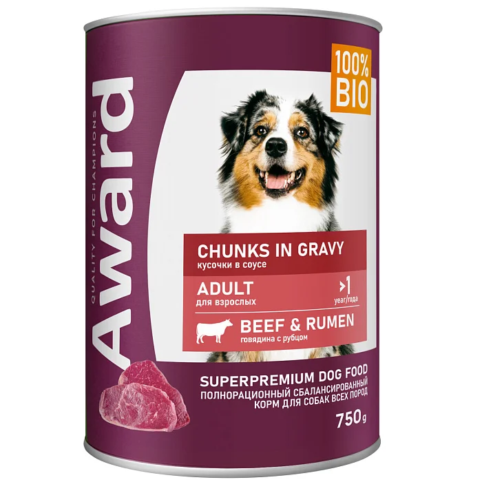 Влажный корм AWARD для взрослых собак кусочки с говядиной и рубцом в соусе 750г.