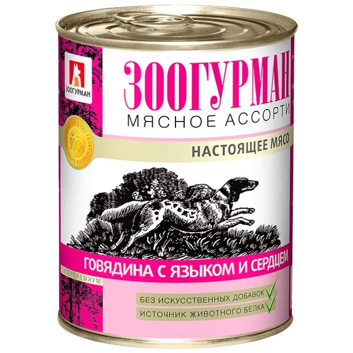 Полноценный консервированный корм для взрослых собак всех пород с говядиной, языком и сердцем.