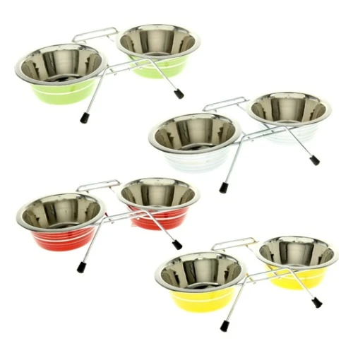 Набор: миска двойная цветная с полосой на подставке VM-3000, 2*360 мл предназначена для корма и воды. Имеет удобную форму чашечек, чтобы животное могло вылизывать их полностью, не прилагая усилий. Подставка оборудована нескользящими ножками.