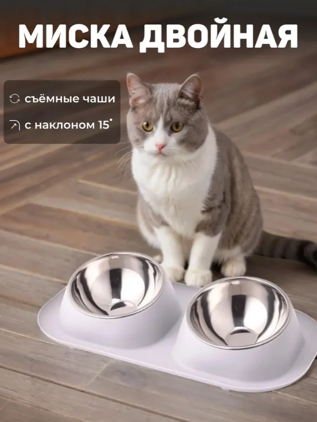 Миска для кошки и собак двойная на подставке с металлическими мисками предназначена для кормления кошек, а также грызунов. Миска для животных состоит из несколько частей: две съёмные чаши из нержавеющей стали и подставка с бортиками. Съемные чаши располагаются под углом, оптимальным для кормления вашего питомца. Миски имеют шарообразную форму, поэтому частички еды не будут скапливаться в уголках как в обычных тарелках. Миска имеет противоскользящие ножки, что делает изделие устойчивым при использовании. Обе чаши можно с легкостью мыть по отдельности. Чаши сделаны из нержавейки, а подставка выполнена из высококачественного пищевого пластика, который совершенно безопасен для животных. Такая миска отлично впишется в интерьер дома и обязательно понравится вашему питомцу.