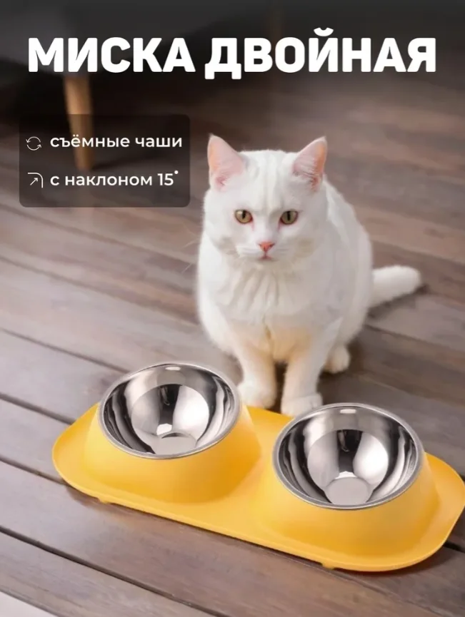 Миска для кошки и собак двойная на подставке с металлическими мисками предназначена для кормления кошек, а также грызунов. Миска для животных состоит из несколько частей: две съёмные чаши из нержавеющей стали и подставка с бортиками. Съемные чаши располагаются под углом, оптимальным для кормления вашего питомца. Миски имеют шарообразную форму, поэтому частички еды не будут скапливаться в уголках как в обычных тарелках. Миска имеет противоскользящие ножки, что делает изделие устойчивым при использовании. Обе чаши можно с легкостью мыть по отдельности. Чаши сделаны из нержавейки, а подставка выполнена из высококачественного пищевого пластика, который совершенно безопасен для животных. Такая миска отлично впишется в интерьер дома и обязательно понравится вашему питомцу.