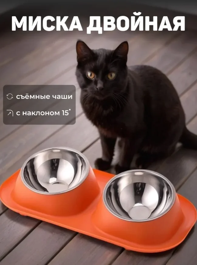 Миска для кошки и собак двойная на подставке с металлическими мисками предназначена для кормления кошек, а также грызунов. Миска для животных состоит из несколько частей: две съёмные чаши из нержавеющей стали и подставка с бортиками. Съемные чаши располагаются под углом, оптимальным для кормления вашего питомца. Миски имеют шарообразную форму, поэтому частички еды не будут скапливаться в уголках как в обычных тарелках. Миска имеет противоскользящие ножки, что делает изделие устойчивым при использовании. Обе чаши можно с легкостью мыть по отдельности. Чаши сделаны из нержавейки, а подставка выполнена из высококачественного пищевого пластика, который совершенно безопасен для животных. Такая миска отлично впишется в интерьер дома и обязательно понравится вашему питомцу.