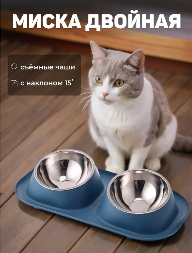 Миска для кошки и собак двойная на подставке с металлическими мисками предназначена для кормления кошек, а также грызунов. Миска для животных состоит из несколько частей: две съёмные чаши из нержавеющей стали и подставка с бортиками. Съемные чаши располагаются под углом, оптимальным для кормления вашего питомца. Миски имеют шарообразную форму, поэтому частички еды не будут скапливаться в уголках как в обычных тарелках. Миска имеет противоскользящие ножки, что делает изделие устойчивым при использовании. Обе чаши можно с легкостью мыть по отдельности. Чаши сделаны из нержавейки, а подставка выполнена из высококачественного пищевого пластика, который совершенно безопасен для животных. Такая миска отлично впишется в интерьер дома и обязательно понравится вашему питомцу.