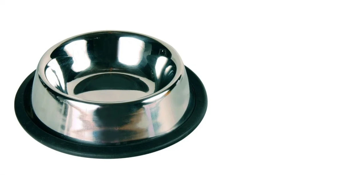 Миска стальная, на резиновой подложке (нескользящая). Подходит для кормления щенков и собак средних пород. Объём: 950 мл.