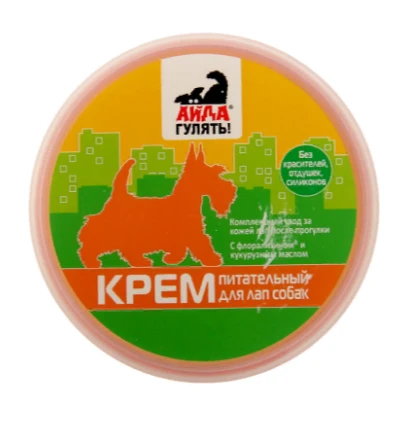 Крем «Айда гулять!» — средство для ухода за лапами собак после прогулки. Изготавливается на основе натуральных ингредиентов, не содержит красителей и отдушек, не имеет противопоказаний к применению, не вызывает побочных эффектов.
