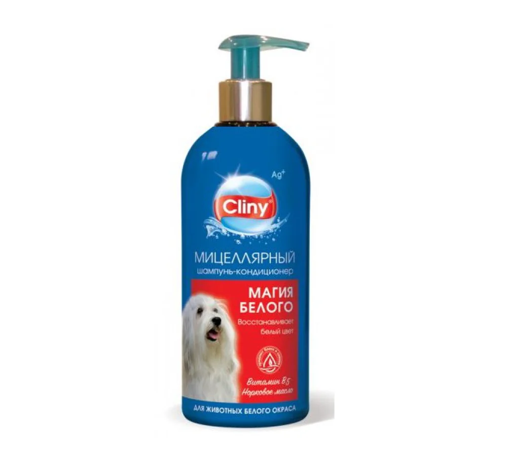 Шампунь-кондиционер Cliny Магия белого разработан для ухода за домашними питомцами с белым цветом шерсти.